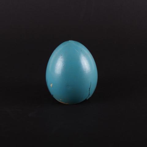 Objeto doméstico de entretención. Figura zoomorfa de madera que representa a un conejo de cuerpo pintado color amarillo. Nariz roja. En sus patas, ruedas pintadas color dorado. Cinta rosada en el cuello. Estructura pintada de color rojo fija a ambos lados de su cuerpo, la que termina en un anillo que contiene una figura hueca de color celeste que representa a un huevo abierto en su parte superior. En su interior huevo color burdeo. Ruedas pintadas de color rojo.