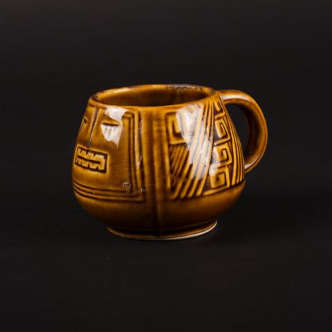 Objeto utilitario. Contenedor elaborado en cerámica esmaltada de color ocre. Cuerpo globular, base plana y boca restringida. Un asa cinta en el cuerpo. En la superficie diseños geométricos. En el centro rostro.