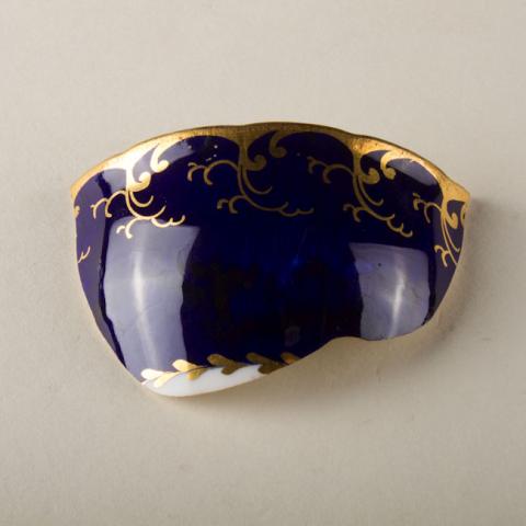 Objeto de uso doméstivo. Recipiente cilíndrico y color blanco. Sector inferior blanco delimitado por una guirnalda de hojas en dorado. El sector superior en azul cuyo borde se decora con volutas doradas dispuestas verticalmente que nacen desde una franja dorada. Asa en voluta con aplicación dorada en el sector superior. Faltante en el sector medio.