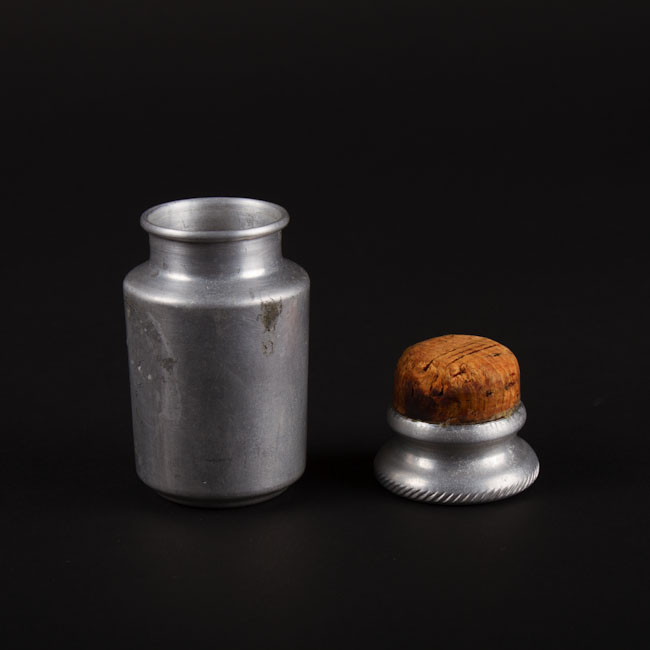 Objeto de uso doméstico. Contenedor cilíndrico con tapa elaborado en latón. Interior de la tapa de corcho. En la superficie inscripciones en sobre relieve.