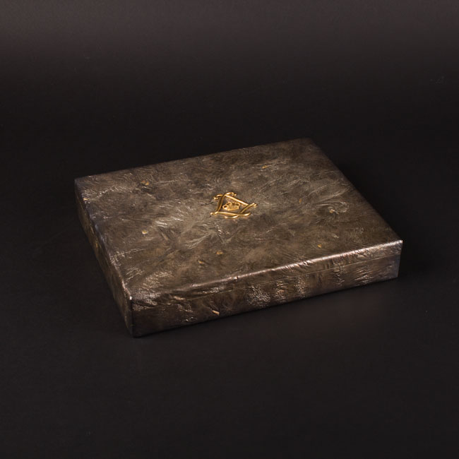 Objeto de uso doméstico. Contenedor con tapa abatible de forma rectangular elaborado en metal. En el interior dos compartimentos forrados en madera. Superficie rugosa. Sobre la tapa inscripción dorada en sobre relieve con figura que representa a una corona en el centro.