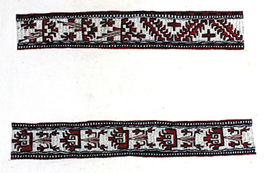 Obra visual de formato rectangular y disposición horizontal, la composición reproduce dos banda rectangulares y estrechas ubicados en forma paralela; con un diseño ornamental geométrico, de color rojo sobre blanco. El objeto es un trarihue o faja, su diseño que repite, un elemento escalonado, lakutuwe, que es propio de la cultura mapuche.