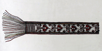 Obra visual de formato rectangular y disposición horizontal, la composición reproduce una banda rectangular, estrecha con un diseño ornamental geométrico, de color rojo sobre blanco; del extremo penden largos flecos. El objeto es un trarihue o faja, su diseño repite, un elemento escalonado, lakutuwe, que es propio de la cultura mapuche.
