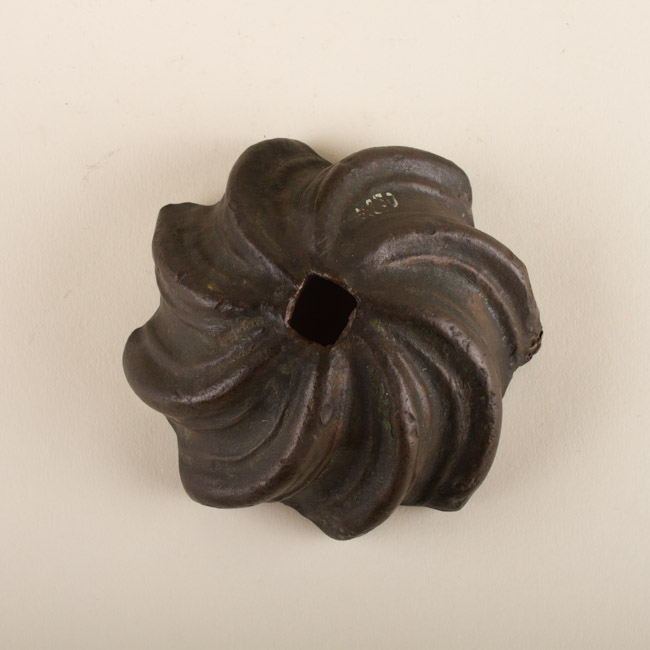 Objeto elaborado en metal. Pieza semi circular con orificio cuadrado en el centro. Superficie con ondas verticales en sobre relieve. Base con forma de estrella de ocho puntas. Reverso cóncavo. Corresponde a la parte superior de una pieza utilizada en la construcción.