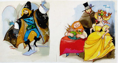 Objeto bidimensional de formato rectangular, dispuesto horizontalmente. La composición representa dos escenas, a la izquierda una figura masculina con botas y abrigo, en posición de brincar. A la derecha dos figuras femeninas con vestido amarillo y falda roja, y un personaje masculino con capa y sombrero de copa.