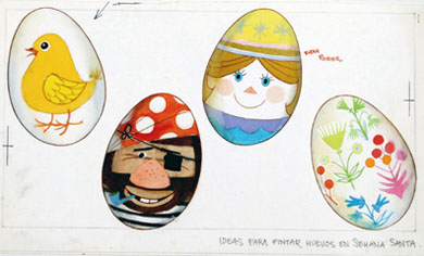 Objeto bidimensional de forma rectangular, dispuesto horizontalmente. Representa cuatro figuras con formas de huevos pintados con distintos motivos y colores.