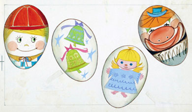 Objeto bidimensional de forma rectangular, dispuesto horizontalmente. Representa cuatro huevos pintados con distintos motivos y colores.