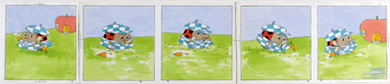 Obra visual de formato rectangular y disposición horizontal; es un ilustración compuesta de cinco viñetas, con un personaje, insecto tipo mariquita, junto a una calabaza y colores verde y celeste.