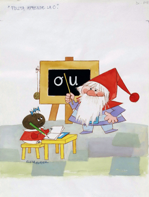 Composición rectangular. En primer plano vemos personaje antropomorfo femenino infantil sentado en un pupitre. A su lado se encuentra un personaje barbado con gorro rojo y traje azul que lleva un puntero en su mano y señala las vocales O y U en una pizarra.