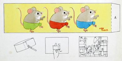 Obra bidimensional en formato rectangular en disposición horizontal. Composición a color para recortar y armar compuesta, en la parte superior, por un dibujo de tres ratones grises en vista de perfil con pantaloncillos de colores azul, rojo y verde respectivamente. En la parte inferior dibujo en blanco y negro con instrucción de armado.