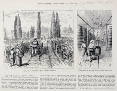 Obra visual de formato rectangular y disposición vertical, es una composición monocroma que esta dispuesta en una lámina, con texto impreso; la imagen esta divida en dos representaciones a la izquierda se observa una paisaje rural con un viñedo que al centro tiene un sendero con vías y un carro con un hombre de espalda, además, dos mujeres de pie.