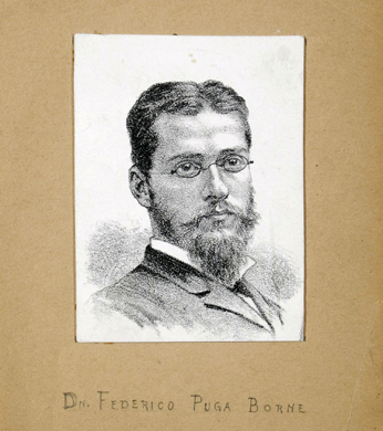 Obra visual de formato rectangular y disposición vertical, la composición es un retrato masculino de rostro barbado, ubicado en forma frontal; sus facciones son de aspecto joven, tiene cabellos oscuros y pequeños anteojos. Al extremo inferior se observa su vestimenta, una camisa de cuello elevado y las solapas de la su chaqueta.