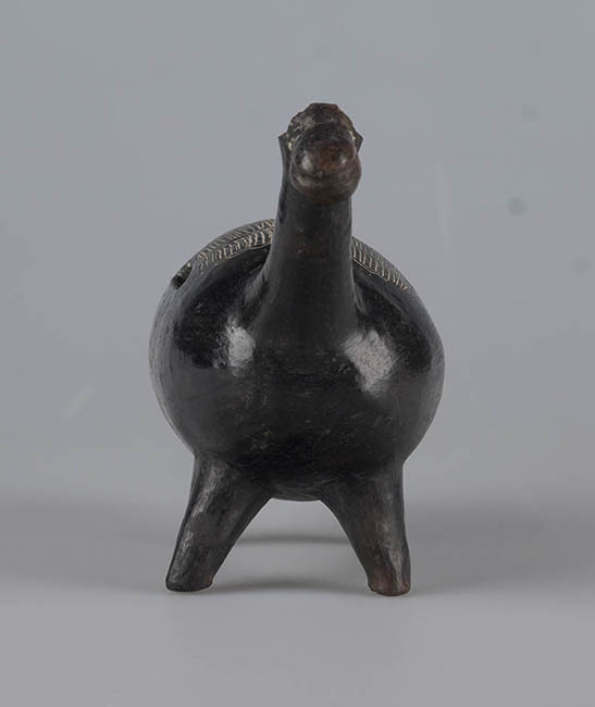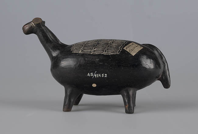 Figura zoomorfa de greda negra, que representa una llama parado, con cuerpo alargado, hocico ancho, cola larga, patas cortas y en el lomo con rayas incisas restas y curvas.. Posee una ranura al costado. El acabado es pulido, brillante, homogéneo.