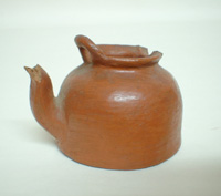Recipiente de greda color rojizo, con un cuerpo globular, cuello bajo, boca ancha con asa curva vertical sobre el labio, pico largo y curvo y base plana. Acabado pulido, brillante homogéneo.