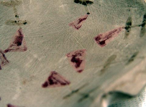 Plato de form rectangular con esquinas redondeadas, pocca profundidad y bordes aplanados de color blanco-gris. Presenta líneas incisas en bajo relieve, no intencionadas, y decoraciones fitomorfas en color violeta y verde.