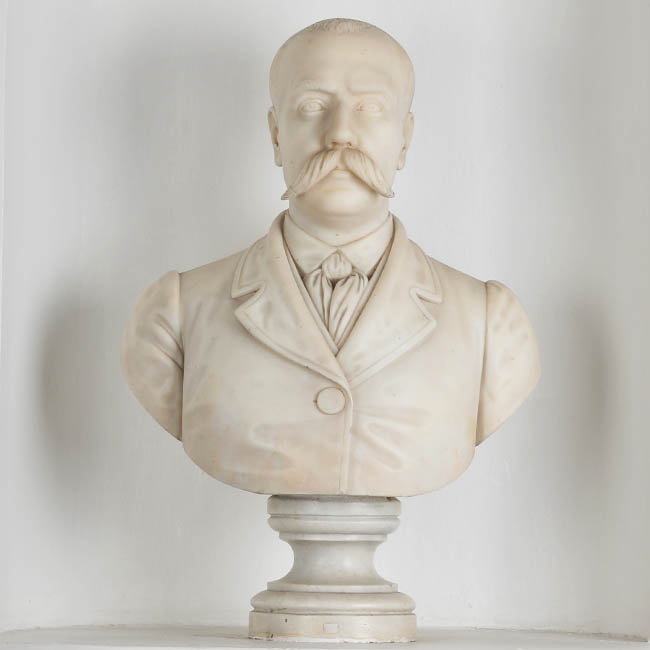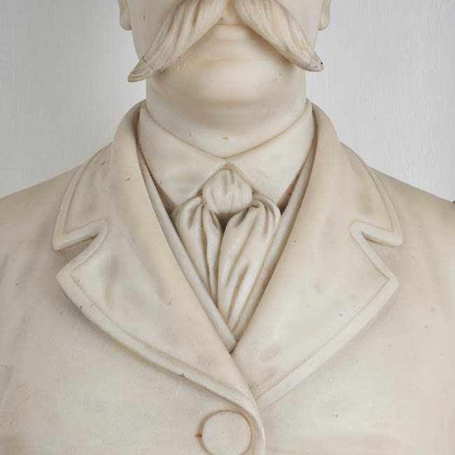 Busto en mármol de Benjamín Vicuña Mackenna. Figura masculina de busto, lleva bigotes gruesos y largos, viste camisa, pañuelo y traje de solapa con gran botón en el centro.