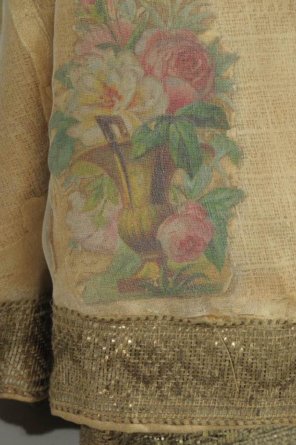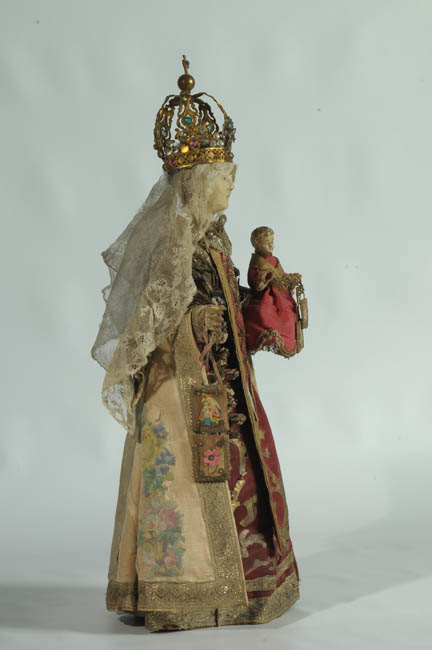 La figura femenina, de tez blanca y ojos claros, viste una túnica de color rojo con decoraciones y bordados dorados, sobre la que hay una capa de color blanco con decoraciones florales de colores y bordes dorados bordados. El cuello y mangas son de encaje de color blanco. Sobre su cabeza viste un velo largo de encaje de color blanco, sobre el que lleva corona dorada con pedrería y cruz en la cima. En su mano derecha porta un escapulario.