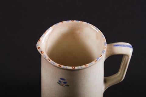 Objeto de uso doméstico. Base redonda, cuerpo liso y borde redondeado con un pequeño vertedero. Tiene un asa lateral. De fondo beige con pequeñas decoraciones circulares de color azul y verde.