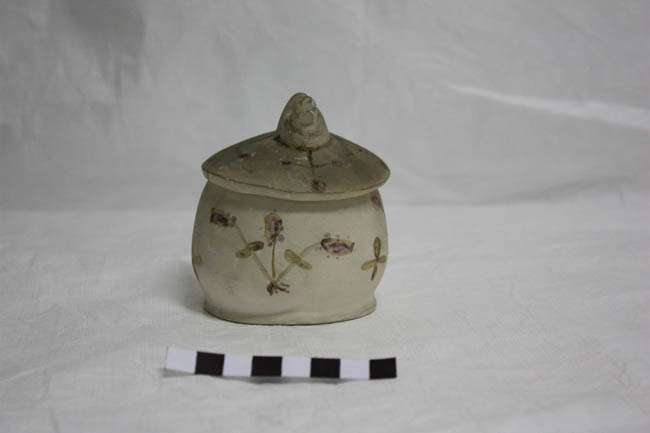 Envase contenedor de polvos de greda pintado blanco adornado con motivos florales. Tiene una tapa con un ave como asa.