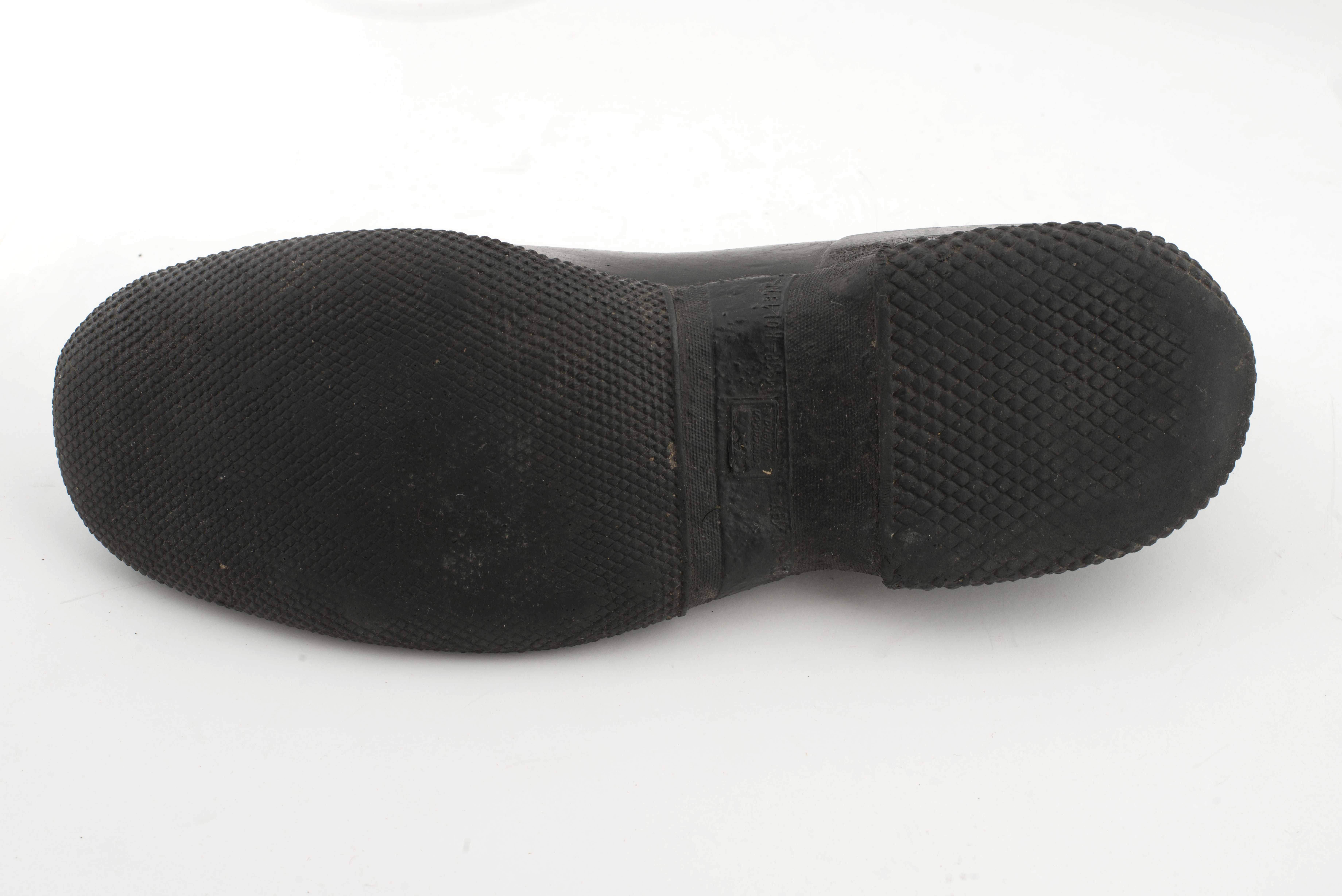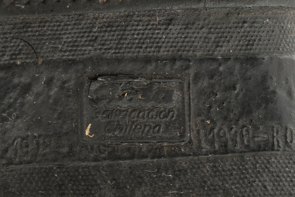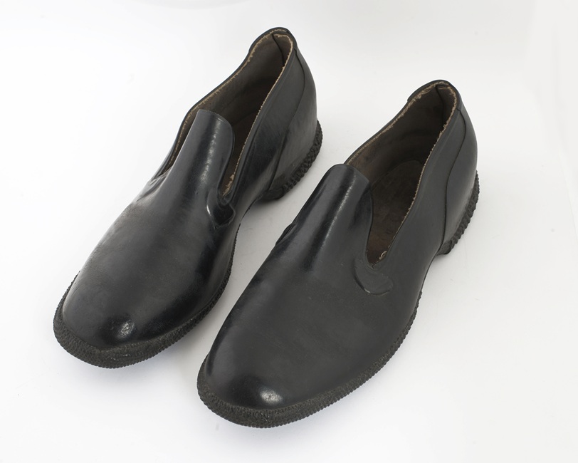 Par de zapatos masculinos llamadas galuchas, elaboradas en goma negra, tipo mocasín con suela de goma. El interior está forrado con tela de algodón. Marca Bata.