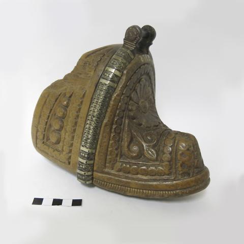 Posee base redondeada y la zona inferior frontal en forma de media luna con decoraciones incisas en base a semicircunferencias y adornos incisos. La parte superior lleva un agregado que remata en un anillo. La zona posterior inferior está calada para introducir el pie.