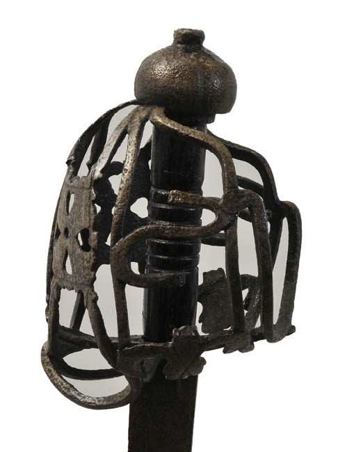 Arma blanca compuesta por una empuñadura en forma de cesta con pomo en forma de botón y una hoja recta con un vaceo central.