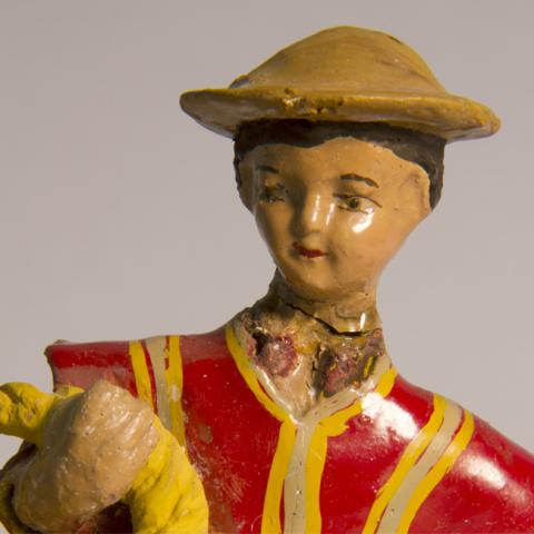 Objeto decorativo de cerámica esmaltada. La pieza consiste en una figura antropomorfa masculina de pie, la cual viste un chamanto de color rojo con rayas verdes y amarillas, un sombrero amarillo, pantalones rojo y zapatos negros. En la mano derecha tiene un recipiente de color amarillo y en la mano izquierda sostiene un farol. La pieza tiene una base de forma circular.