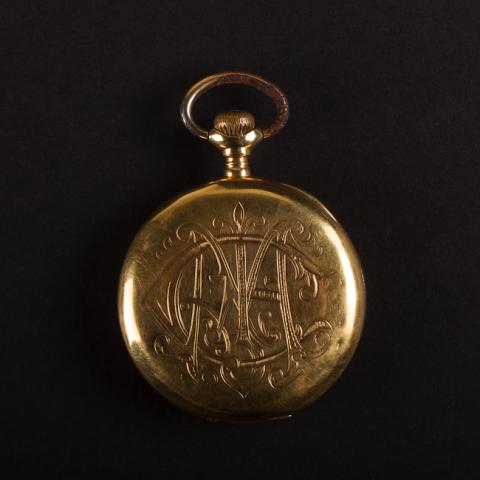 Objeto de uso personal correspondiente a un cronómetro de bolsillo. Reloj mecánico con esfera de color blanco y numeración romana en color negro. Tanto los punteros como la caja que cubre la esfera son de material metálico dorado. La caja presenta un gancho de forma ovalada en su extremo superior y tapa de vidrio. Presenta bisagras para levantar la tapa o cubierta de vidrio, ubicada sobre la esfera.