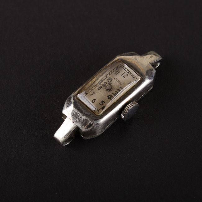 Objeto de uso personal. De forma rectangular, tiene un vidrio al centro que permite ver un fondo blanco con números y dos punteros que indican la hora. En la parte superior e inferior lleva unas abrazaderas para la pulsera. En un costado tiene una perilla circular.