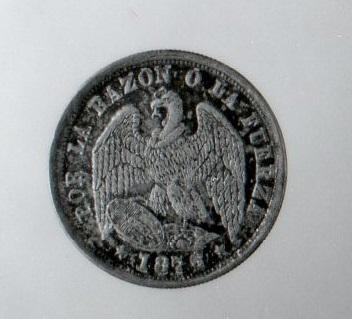 Objeto metálico de formato circular. En el anverso presenta la figura de un cóndor de pie, con alas abiertas y junto al borde la inscripción POR LA RAZÓN O LA FUERZA y la fecha 1875, en la base. El en reverso aparece la inscripción MEDIO / DÉCIMO, circundada por ramas de laurel, atadas con una lazo en la base; junto al borde tiene la inscripción REPÚBLICA DE CHILE.
