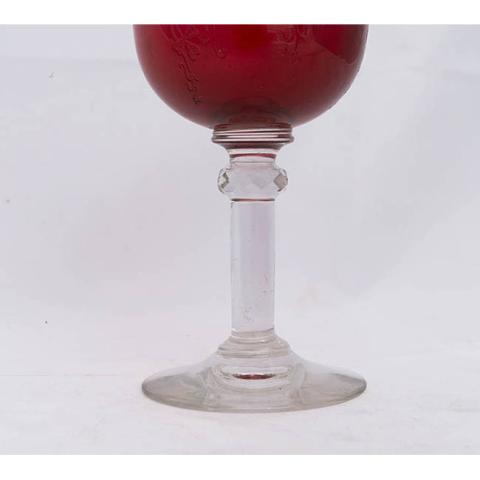 Objeto de uso doméstico. Recipiente de vidrio con base plana circular transparente, pie cilíndrico liso con terminación superior de anillo biselado, contenedor redondeado color granate con tallados fitomorfos. Posee boca circular de labio liso.