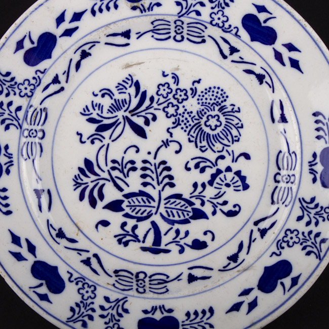 Objeto de uso decorativo. Recipiente cóncavo blanco circular decorado en azul con figuras fitomorfas y geométricas tanto en el centro como en el borde.