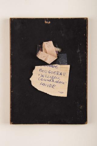 Objeto decorativo. Composición basada en una figura femenina sentada en un trono decorado con figuras fitomorfas. Manos en alto, ojos mirando al cielo, vestido rojo, manto azul que cubre su cabeza y aureola dorada. Sobre sus rodillas, figura femenina de cabellera rubia larga hincada con vestido azul y manos cruzadas. En sus pies niño recostado durmiendo, piernas separadas y brazo extendido cubierto con flores. Sobre la escena, en sobre relieve guirnalda de flores de colores. Marco de madera cuyas esquinas presentan cuadrados en sobre relieve. En sus bordes internos y externos círculos tallados. En la parte inferior inscripción en placa metálica.