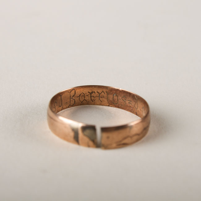 Objeto de uso personal. Corresponde a una lámina metálica circular. Inscripción incisa en el reverso. Se encuentra al interior de una caja azul con tapa abatible sobre un soporte cilíndrico afelpado. Junto a esta fragmentos de otro anillo.