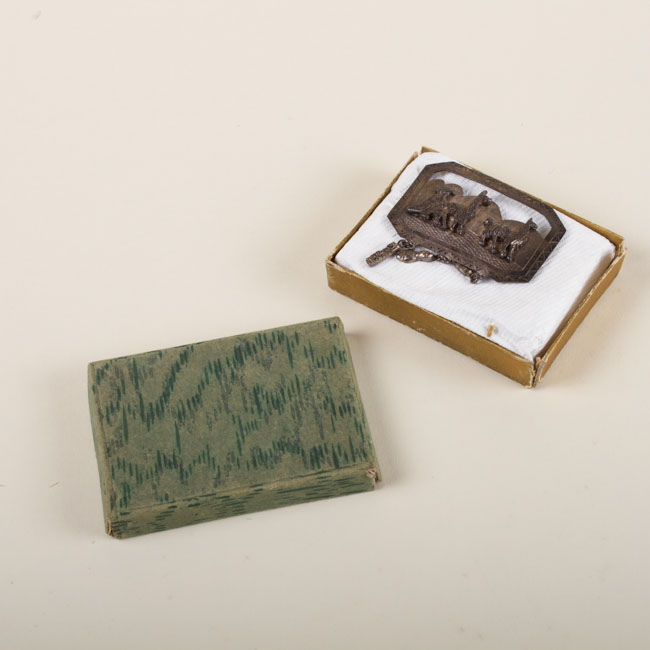 Objeto de uso personal. Rectángulo de borde metálico. En su interior, semi círculos con diseños de filigrana que se desprenden de los bordes. En el centro y sobre ellos figura metálica de camélido. en el reverso, fragmento del gancho de sujeción.