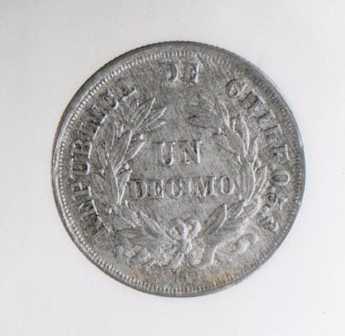 Objeto metálico de formato circular. En el anverso aparece la inscripción UN / DÉCIMO, circundada por dos ramas de laurel atadas con una cinta. Le rodea una leyenda. Al reverso, un cóndor con alas recogidas y una leyenda.