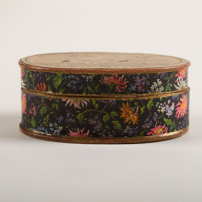 Objeto utilitario. Contenedor ovalado con tapa elaborado en cartón forrado en papel. En el canto, diseños florales de colores sobre fondo negro. En la tapa, adhesivo central con texto impreso en dorado.