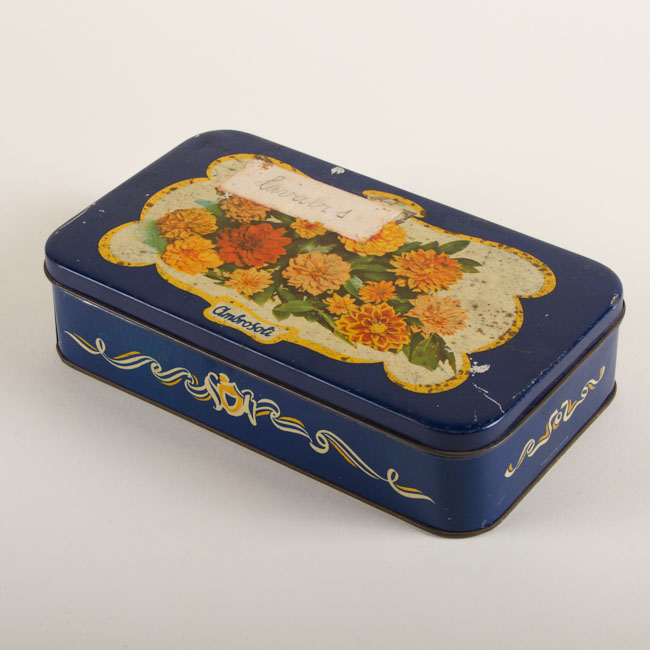 Objeto de forma rectangular. Tiene tapa y base. Es de color azul. En el anverso de la tapa hay una decoración fito morfa que contiene trece flores. Por el reverso es liso y tiene una leyenda. Los costados son azules.