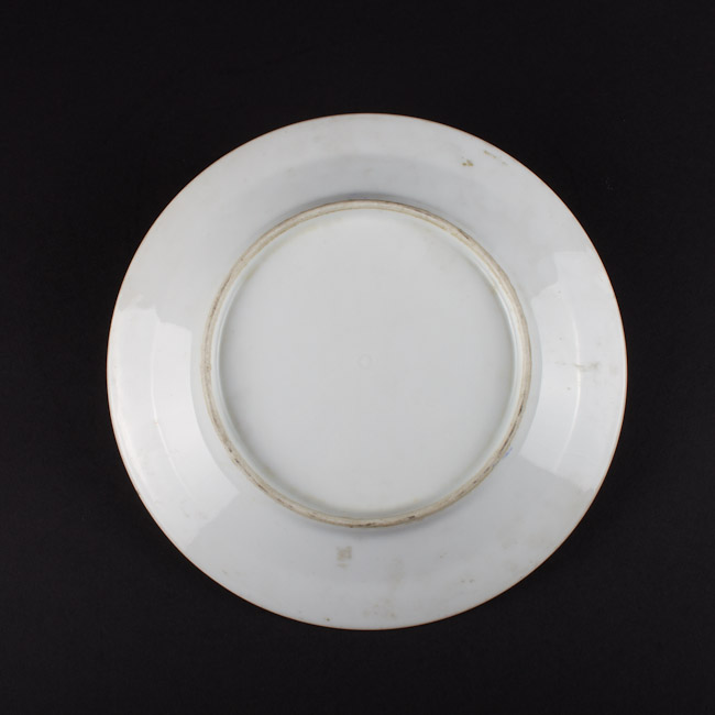 Objeto de uso doméstico. Recipiente cóncavo circular blanco con franja verde al centro y más gruesa en el borde. Posee monograma verde en el borde rodeado de corona de hojas.