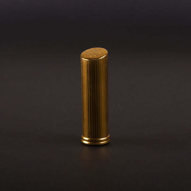 Objeto de forma circular, de tapa y base. De color dorado. La tapa es estriada y con tapa inclinada, lleva una leyenda. Al interior una leyenda y una pasta de color rosado.
