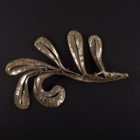 Objeto decorativo. Figura fitomorfa elaborada mediante una estructura metálica e hilo de plata. En el reverso gancho para fijación.