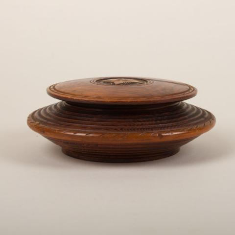Objeto doméstico utilitario elaborado en madera tallada. Contenedor lentiforme. En la superficie anillos concéntricos. Boca restringida. Tapa fija mediante hilo. En la parte superior de la tapa, diseños geométricos en sobre relieve.