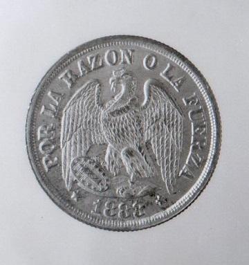 Objeto metálico de formato circular. En el anverso aparece la inscripción UN / DÉCIMO, circundada por dos ramas de laurel atadas con una cinta. Le rodea una leyenda. Al reverso, un cóndor con alas recogidas y una leyenda.