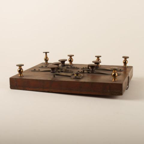 Objeto de uso militar. Era utilizado para hacer explosionar material explosivo. De forma rectangular, tiene cinco elementos horizontales planos en los cuales están emplazados cinco perillas verticales. Tiene seis perillas redondeadas con un tope plano.