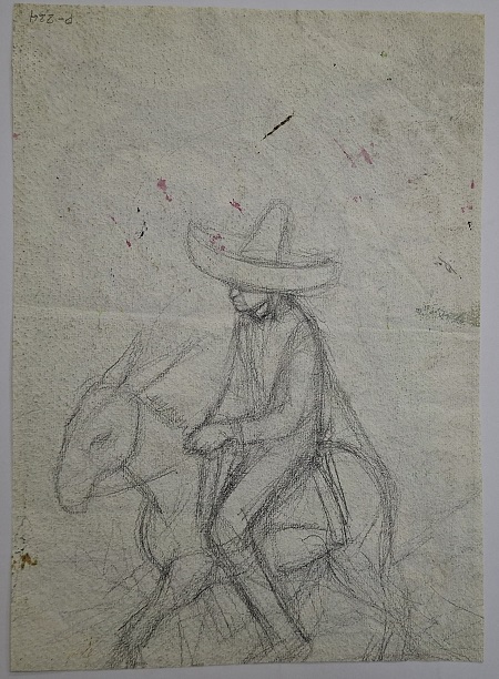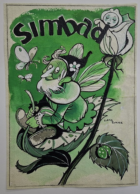 Obra visual de formato rectangular y disposición vertical. Dibujo policromado. En el centro de la composición se destaca una figura masculina sobre la hoja de una flor. En la parte superior, a modo de título, dice: Simbad. En el reverso tiene un boceto que corresponde a una figura masculina montando un caballo.