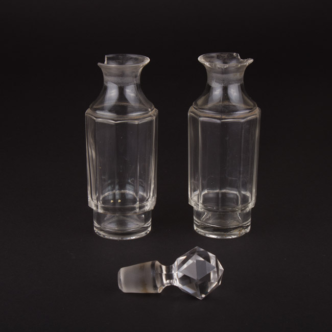 Objeto de uso doméstico. Dos frascos traslúcidos de base lisa, cuerpo estriado, cuello angosto y borde liso.
