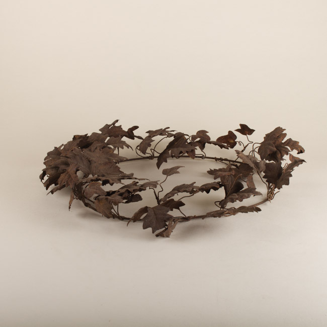 Objeto de uso decorativo. Corona elaborada a partir de un ovalo de alambre desde el cual emergen alambres que llevan en las puntas representaciones fitomorfas de metal dispuestas de manera continua y en distinto tamaño.