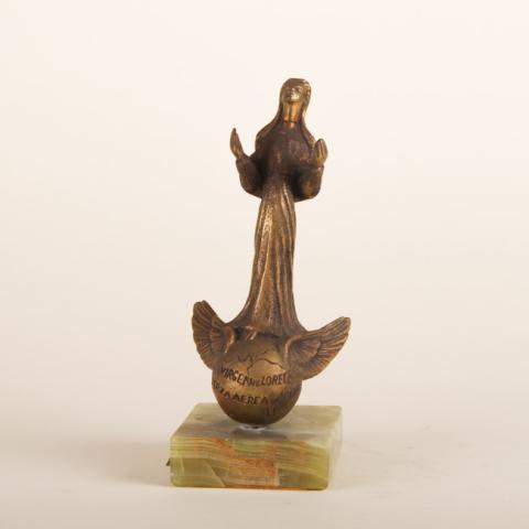 Objeto de uso decorativo. Pieza metálica ocre exenta de figura femenina de cuerpo entero y de pie sobre mundo alado el cual tiene letras inscritas. La figura viste larga túnica y manto, está descalza y tiene sus brazos extendidos. La base se constituye por prisma rectangular de tonos verdosos.