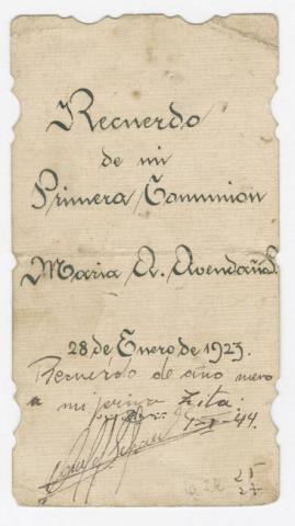 Tarjeta conmemorativa del sacramento de la Primera Comunión de María Avendaño fechado en 1923.