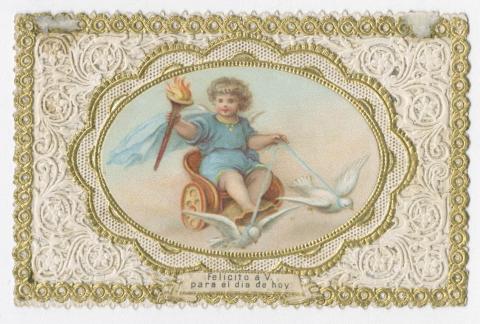 Por el reverso se presenta una segunda composición que presenta una figura infantil alada de cuerpo entero sentada en un carro y guiando dos palomas con su mano derecha. En su mano izquierda sostiene una tea.